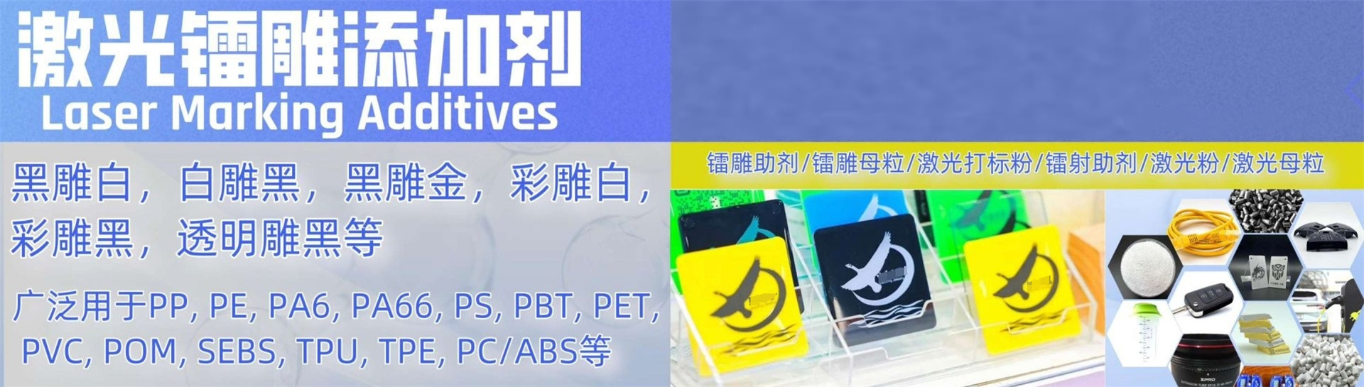 我们是一家集研发、制造、销售为一体的国家高新技术企业,公司是集产学研为一体的研发制造型企业,专业生产镭雕助剂、阻燃剂、抗静电剂,已形成较大的生产和销售规模。经过多年的持续建设和投资,公司研发生产的镭雕助剂(黑雕白、白雕黑,黑雕金,彩雕白,彩雕黑等)产品已达100多种,广泛用于PP, PE, PA6, PA66, PS, PBT, PET, PVC, POM, SEBS, TPU, TPE, PC/ABS等,受到市场广泛认可。